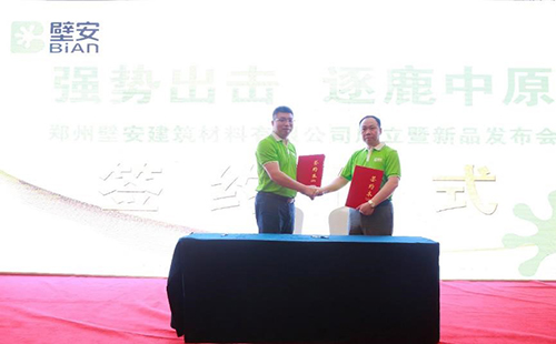 東方雨虹民建公司副總經(jīng)理熊衛(wèi)鋒先生為大會致辭,他表示,憑借東方雨虹的優(yōu)質(zhì)產(chǎn)品服務(wù),創(chuàng)新創(chuàng)客模式,壁安品牌發(fā)展前景巨大。民建公司壁安粘合劑事業(yè)部總經(jīng)理陳明先生向在場嘉賓闡述了壁安品牌的由來及其戰(zhàn)略規(guī)劃,“相信創(chuàng)客,深度分享;相信合作,全面賦能”是壁安平臺給與合作伙伴的承諾與希冀。隨后,陳明先生代表壁安品牌與鄭州壁安建筑材料有限公司董事長張萬祥先生現(xiàn)場簽約,達(dá)成戰(zhàn)略合作協(xié)議。