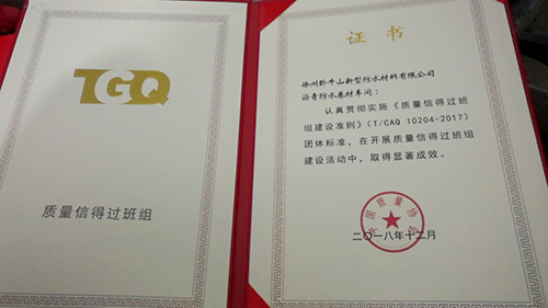 近日,依據(jù)《質(zhì)量信得過班組建設(shè)準(zhǔn)則》,徐州臥牛山瀝青防水卷材車間獲評(píng)中國質(zhì)量協(xié)會(huì)2018年度“質(zhì)量信得過班組”稱號(hào)。