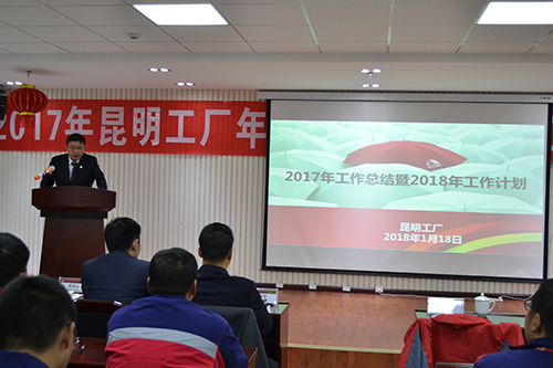陸殿富先生作重要講話,他首先肯定了昆明生產基地在過去一年的變化與成長,隨后他要求生產基地全體人員要加強學習,夯實各崗位的本領,2018年昆明生產基地肩負重任,要從"產品質量、成本管控、創新與成果"等方面進行全面部署,希望生產基地全體員工腳踏實地,努力進取,在2018年實現全面超越自我。