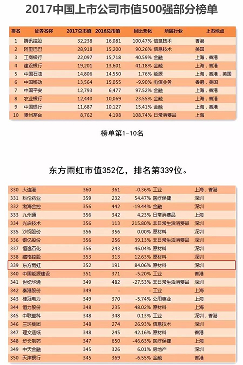 12月29日,東方財富Choice數據發布2017年中國上市公司市值500強榜單。東方雨虹以352億市值名列第339位,較去年上升191位次。