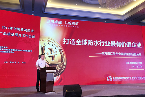 12月7日,“全國建筑防水行業質量提升工作大會”暨2017年建筑防水行業年會在海口召開。住建部、國家質檢總局,質量監督司、執法督查司、工信部原材料司及各省、自治區、直轄市質量監督局等有關人員出席本次會議。東方雨虹防水集團總裁劉斌受邀出席,并發表題為“打造最有價值企業”的演講。