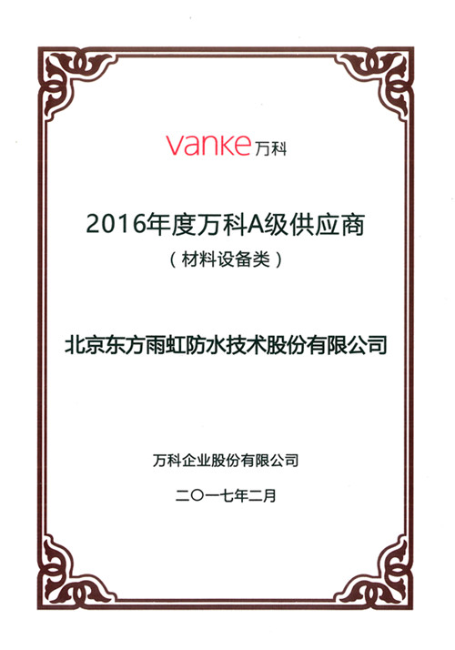 大道當(dāng)然、攜手共贏!自2013年起,萬(wàn)科每年都會(huì)對(duì)供應(yīng)商進(jìn)行評(píng)估分級(jí),向社會(huì)發(fā)布合格供應(yīng)商名錄,使之成為萬(wàn)科供應(yīng)商管理的重要依據(jù)。2016年,萬(wàn)科對(duì)評(píng)估方法再次升級(jí),將第三方質(zhì)量評(píng)估成績(jī)、天網(wǎng)行動(dòng)材料檢測(cè)合格率、客服返修率以及分公司合作反饋等多個(gè)維度相結(jié)合,建立可量化、可考核、可追溯的全維度評(píng)估體系,對(duì)總包、裝修總包、景觀綠化、門(mén)窗幕墻、材料設(shè)備五大類(lèi)供應(yīng)商進(jìn)行了評(píng)估分級(jí)。在此背景下,東方雨虹仍連續(xù)4年榮獲“A級(jí)供應(yīng)商”,是雙方在精誠(chéng)合作的基礎(chǔ)上,來(lái)自萬(wàn)科對(duì)東方雨虹防水系統(tǒng)服務(wù)品質(zhì)的肯定。 從2006年與萬(wàn)科集團(tuán)簽訂北京區(qū)域合作協(xié)議,到2008年與蘇南萬(wàn)科戰(zhàn)略協(xié)議,再到2009年與萬(wàn)科簽署集團(tuán)戰(zhàn)略采購(gòu)協(xié)議,10余年來(lái),東方雨虹以品質(zhì)與服務(wù)贏得萬(wàn)科的信任,同時(shí)也憑借此與包括萬(wàn)科在內(nèi)的100余家大型房地產(chǎn)商、企業(yè)集團(tuán)建立長(zhǎng)期穩(wěn)定的戰(zhàn)略合作關(guān)系。接下來(lái),秉承著“為人類(lèi)為社會(huì)創(chuàng)造持久安全的環(huán)境”,以“防水系統(tǒng)服務(wù)商”為定位,東方雨虹將一如既往以卓越品質(zhì)與優(yōu)質(zhì)服務(wù)為基礎(chǔ),不遺余力地成就“好房子不漏水”。