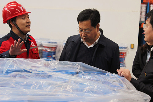 馬希良參觀了卷材車間、卷材庫房和涂料車間,并對東方雨虹先進的設備、優質的產品和高科技的倉儲管理系統給予了高度的贊許和肯定。魯家華為考察團介紹了咸陽生產基地具體情況,尤其是年產能2000萬平米的先進卷材生產線:引進自意大利BOATO的多功能防水卷材生產線和美國R&D公司的3000型防水卷材生產線。作為全球化的防水系統服務商,東方雨虹的生產基地正在向高科技全智能化企業發展。
