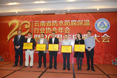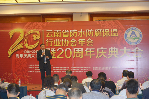 4月13日,云南省防水防腐保溫行業協會2015年年會暨二十周年慶典大會在昆明世紀金源大酒店隆重舉行,中國建筑防水協會、云南建設廳、云南省質量監督局等部門領導、協會領導及企業家共計200余人參加。