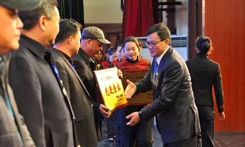 ?平輿縣委、縣政府表彰2015年度建筑防水先進企業和優秀企業家,李衛國為獲獎企業家頒獎