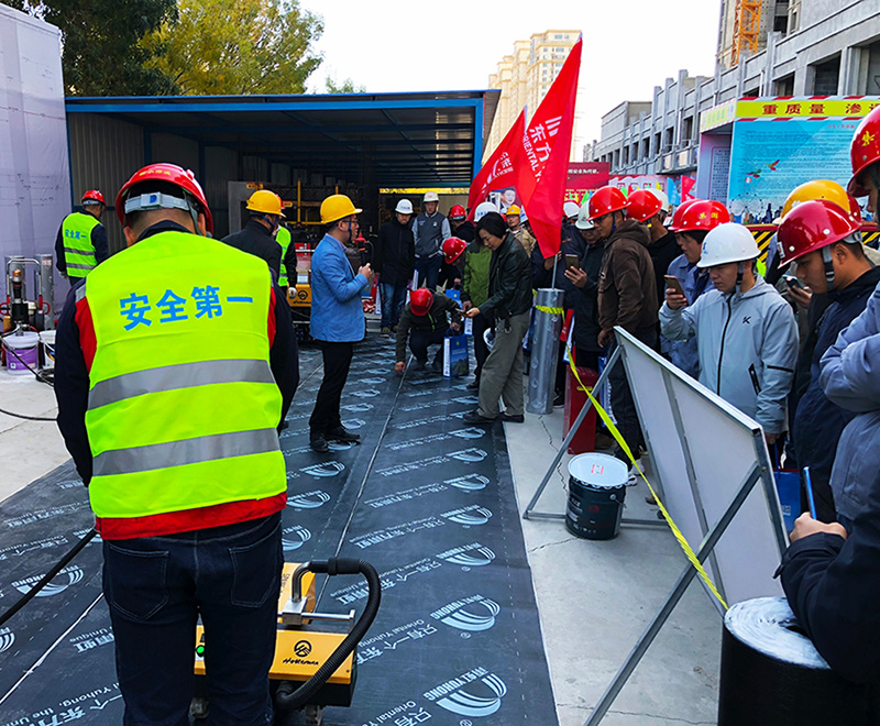 會(huì)上,東方雨虹對近幾年被廣泛應(yīng)用于現(xiàn)代建筑中的非固化復(fù)合防水體系的產(chǎn)品特點(diǎn)和施工工藝進(jìn)行詳細(xì)講解。為了提高建筑防水施工效率,并減少人為因素造成的誤差,東方雨虹技術(shù)人員現(xiàn)場展示了“虹人”智能型熱熔防水卷材攤鋪機(jī)車“坦途”和“騎行者”在平面熱熔滿粘施工和熱熔瀝青卷材搭接邊焊接中的應(yīng)用。