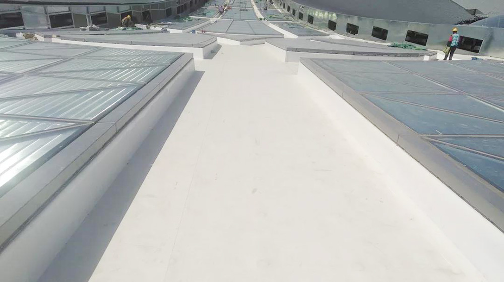 該項目屋面防水等級為一級,在屋面圍護(hù)系統(tǒng)中,指廊部分采用1.5mm織物內(nèi)增強(qiáng)型TPO防水卷材設(shè)置于鍍鋅鋼板與巖面保溫層間,通過鍍鋅鋼支座機(jī)械固定于幾字形檁條,搭接邊采用熱風(fēng)焊接工藝。核心區(qū)與指廊區(qū)采光帶間、采光帶與屋面間通過天溝進(jìn)行分隔,天溝部分采用2.0mm織物內(nèi)增強(qiáng)型TPO防水卷材,防水層采用底部無穿孔固定+天溝側(cè)壁滿粘的工法,防水層完成后卷材直接外露使用。