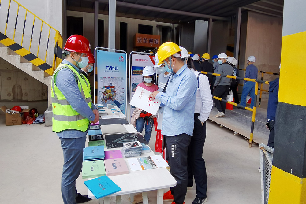 會(huì)上,東方雨虹設(shè)立展位,向與會(huì)人員介紹了地下室底板預(yù)鋪反粘系統(tǒng),非固化橡膠瀝青防水涂料復(fù)合瀝青類卷材系統(tǒng),F(xiàn)D外墻內(nèi)保溫復(fù)合系統(tǒng)等,并現(xiàn)場展示實(shí)體樣板間、模型,普及講解建筑建材系統(tǒng)解決方案的施工工藝及安全操作注意事項(xiàng)。