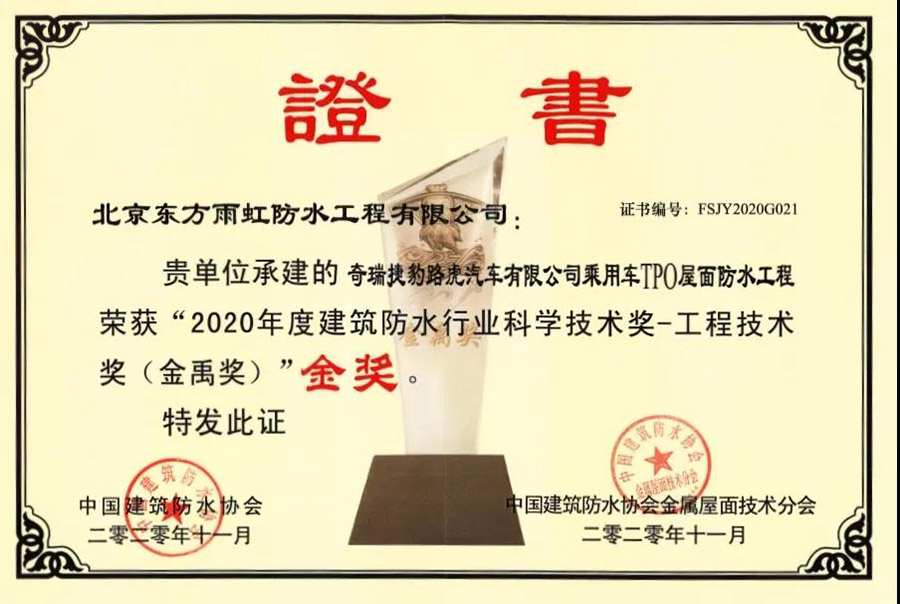 近日,中國建筑防水協(xié)會和《中國建筑防水》雜志社聯(lián)合在全行業(yè)開展了2020年度“建筑防水行業(yè)科學技術獎——工程技術獎(金禹獎)”評選活動。東方雨虹(ORIENTAL YUHONG)3項承建項目分別獲2020年度 “建筑防水行業(yè)科學技術獎——工程技術獎(金禹獎)”金獎,“建筑防水行業(yè)科學技術獎——工程技術獎(金屬圍護系統(tǒng)金禹獎)”金獎、銀獎。評選活動開展的7年間,東方雨虹(ORIENTAL YUHONG)已獲金獎11枚,銀獎6枚。