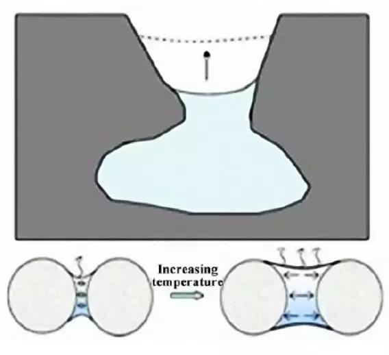 水份向表面的遷移速率時,在靠近表面的粒子之間將會形成復雜的毛細管體系,如圖 3和圖4所示,并在毛細管壁產(chǎn)生毛細壓力 Pc,使毛細孔壁之間或由液體膜分開的兩顆粒之間產(chǎn)生收縮引力 Fa,使得兩粒子被壓縮靠近,此時混凝土尚未形成強度,當收縮驅(qū)動力大于顆粒間的抗拉強度時,則出現(xiàn)塑性收縮裂縫,主要發(fā)生于早期。