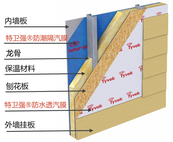 防水透汽膜在輕鋼結(jié)構(gòu)或木結(jié)構(gòu)的應(yīng)用是其最早的應(yīng)用方式,一方面其防風(fēng)性能給建筑提供了一道很好的氣密屏障,降低了空氣滲透導(dǎo)致的對流散熱,讓建筑更節(jié)能;另一方面其透汽性能幫助圍護(hù)結(jié)構(gòu)內(nèi)的水蒸氣擴散,避免建筑受冷凝的損害,保持結(jié)構(gòu)的自然干燥,提高輕鋼或木結(jié)構(gòu)主體的使用壽命。