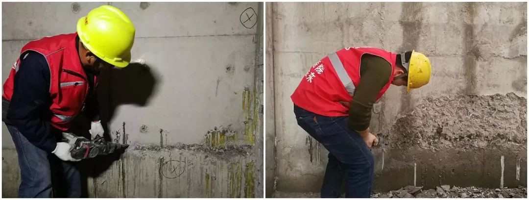 采用凝結時間較長的堵漏2#進行封堵作業(yè)。避免因為凝結速度過快,造成裂縫的產生。清除部位用抗?jié)B1#做整體背防,恢復混凝土的設計強度。