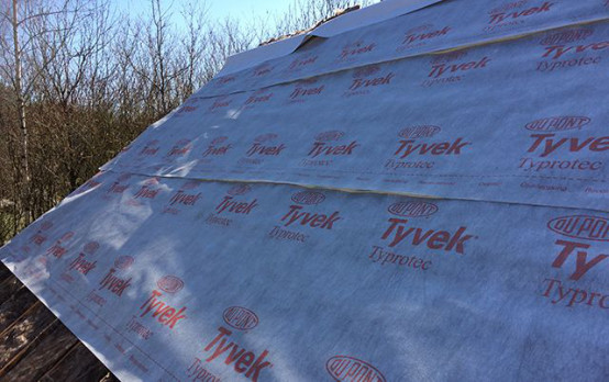 屋面翻新第二步:鋪設(shè)特衛(wèi)強®加強型透汽膜(拼縫處使用特衛(wèi)強®膠帶密封以保證屋面系統(tǒng)的氣密性,防止熱量損失。)