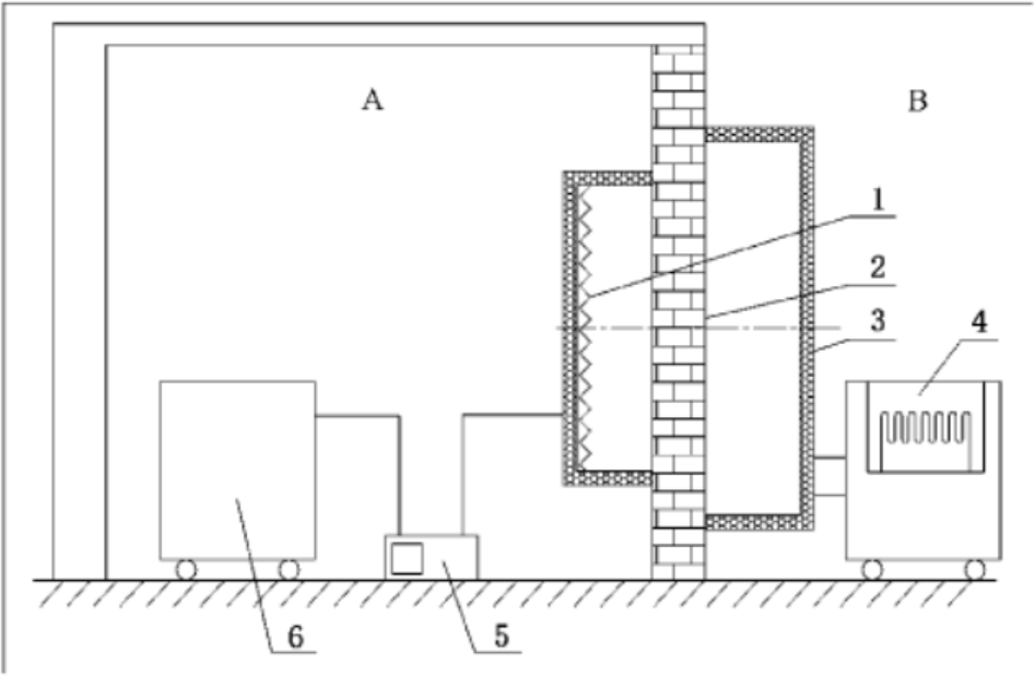 (1.計(jì)量熱箱;2.被測圍護(hù)結(jié)構(gòu);3.冷箱;4.制冷裝置;5.控制器;6.環(huán)境加熱器:A.室內(nèi);B.室外。)