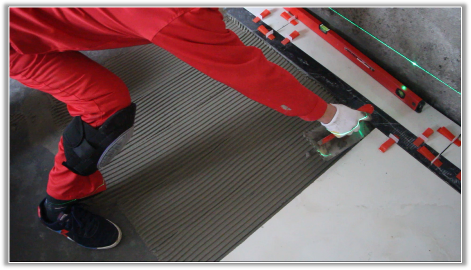 用鉗子固定找平器楔子并用靠尺檢查是否鋪貼平整